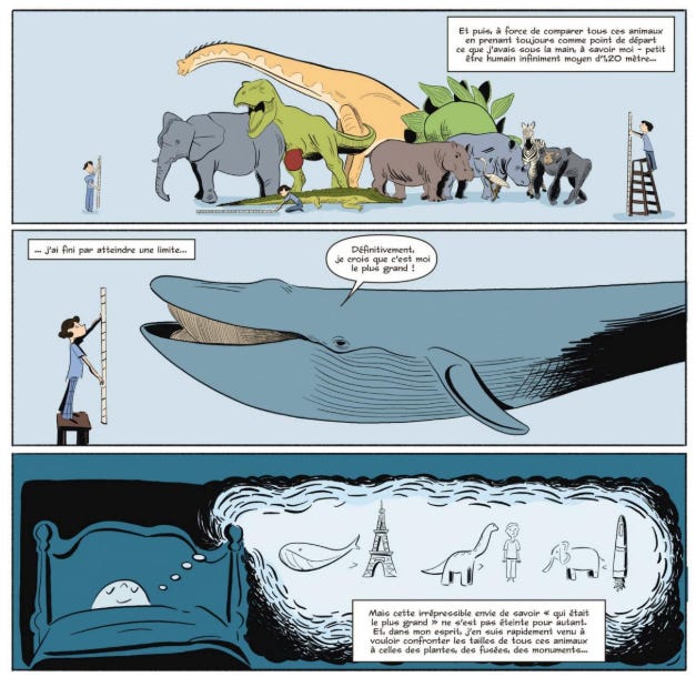 Cette semaine, nous vous invitons à faire un voyage scientifique des plus singuliers. Dans cet album, vous allez prendre conscience de votre taille, de vos mesures et de ce qu’elles représentent dans l’univers. Balade mentale – Voyage dans l’infiniment grand démarre d’abord à hauteur d’homme, puis élargit son champ d’action pour visiter le règne animal, l’architecture avant de partir dans le cosmos. La Terre rapetisse, les planètes deviennent géantes, puis surgissent les étoiles, les galaxies, les superamas… Avec clarté et poésie, le Youtubeur Théo Drieu, spécialiste de la médiation scientifique, explore l’espace observable dans une spirale vertigineuse. Échelles de valeurs, mesures, infiniment petit et infiniment grand, l’album essaie de répondre à la question “Est-il seulement possible de se représenter la taille de l’univers ?”. Pas après pas, l’auteur va tenter de vous y aider. Le commentaire pédagogique, associé aux dessins limpides de Giulia Mammone, traduit ce voyage avec érudition. Se perdre dans l’infini pour mieux comprendre notre place n’aura jamais été aussi instructif.