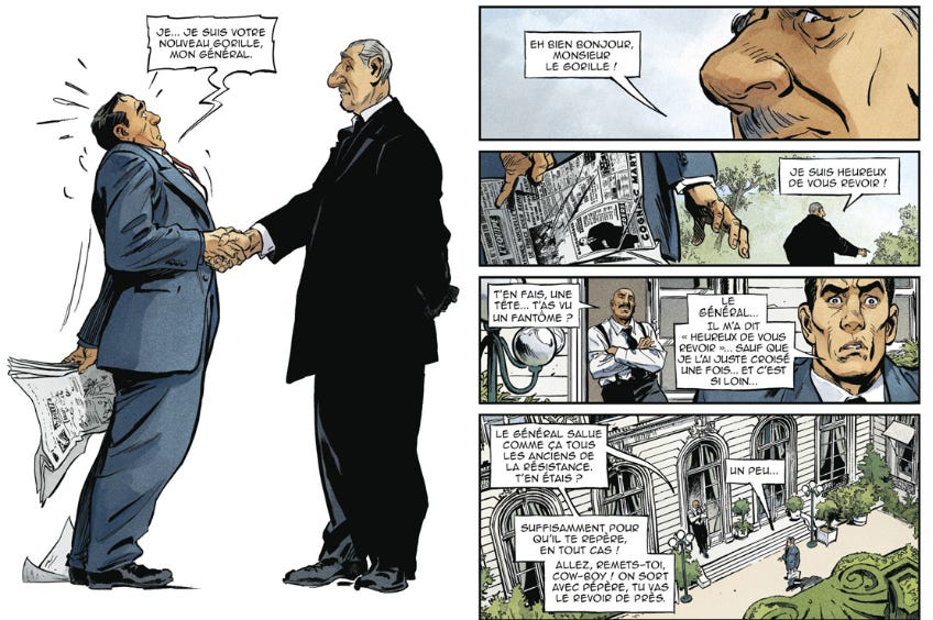 Sous la pluie d’un Paris sous tension, quatre silhouettes en imper — un Corse, un Kabyle, un ex-boxeur, un jeune flic formé au FBI — veillent sur “Pépère”. Les cercueils des soldats tombés en Algérie s’alignent, les attentats du FLN se multiplient en métropole, et de Gaulle, rappelé pour sortir la France de l’impasse, devient l’un des dirigeants les plus exposés au monde. Dans Les Gorilles du Général, Dorison et Telo racontent la Ve République depuis ses coulisses : celles de gardes du corps pris entre menaces concrètes, paranoïa politique et refus obstiné du président de toute protection visible. Inspiré des vrais personnages, le récit jongle librement entre faits documentés et fiction nerveuse. Dialogues façon Audiard, argot des années 60, dessins aux “gueules” marquées : tout évoque le meilleur du polar français. Derrière l’action et les tensions politiques, une fresque humaine surgit — faite de failles, de fidélités, de désillusions. Ce récit tendu, précis, qui ranime une époque au bord de la rupture, confirme une nouvelle fois le talent narratif de Dorison.