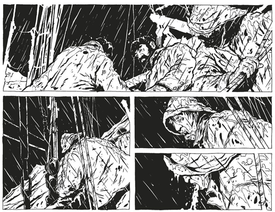 Dans les brumes de l’Atlantique Nord, 28 hommes embarquent sur La Marie-Jeanne pour une campagne de pêche à la morue. Les rapports sont rudes et violents mais quand le corps du second d‘équipage est retrouvé poignardé, la véritable descente aux enfers commence. Huis clos tendu, récit noir à la frontière du documentaire et du polar, Terre-Neuvas dévoile un univers brutal, rythmé par la faim, le froid et la peur. À travers ses séquences noir et blanc d’une rare puissance visuelle, Chabouté excelle dans l’évocation d’une mer implacable et d’un système où la rentabilité vaut plus qu’une vie. À la fois thriller et fresque sociale sur ces “forçats de la mer”, cet album est une œuvre magistrale, qui laisse le lecteur à la dérive longtemps après la dernière page.