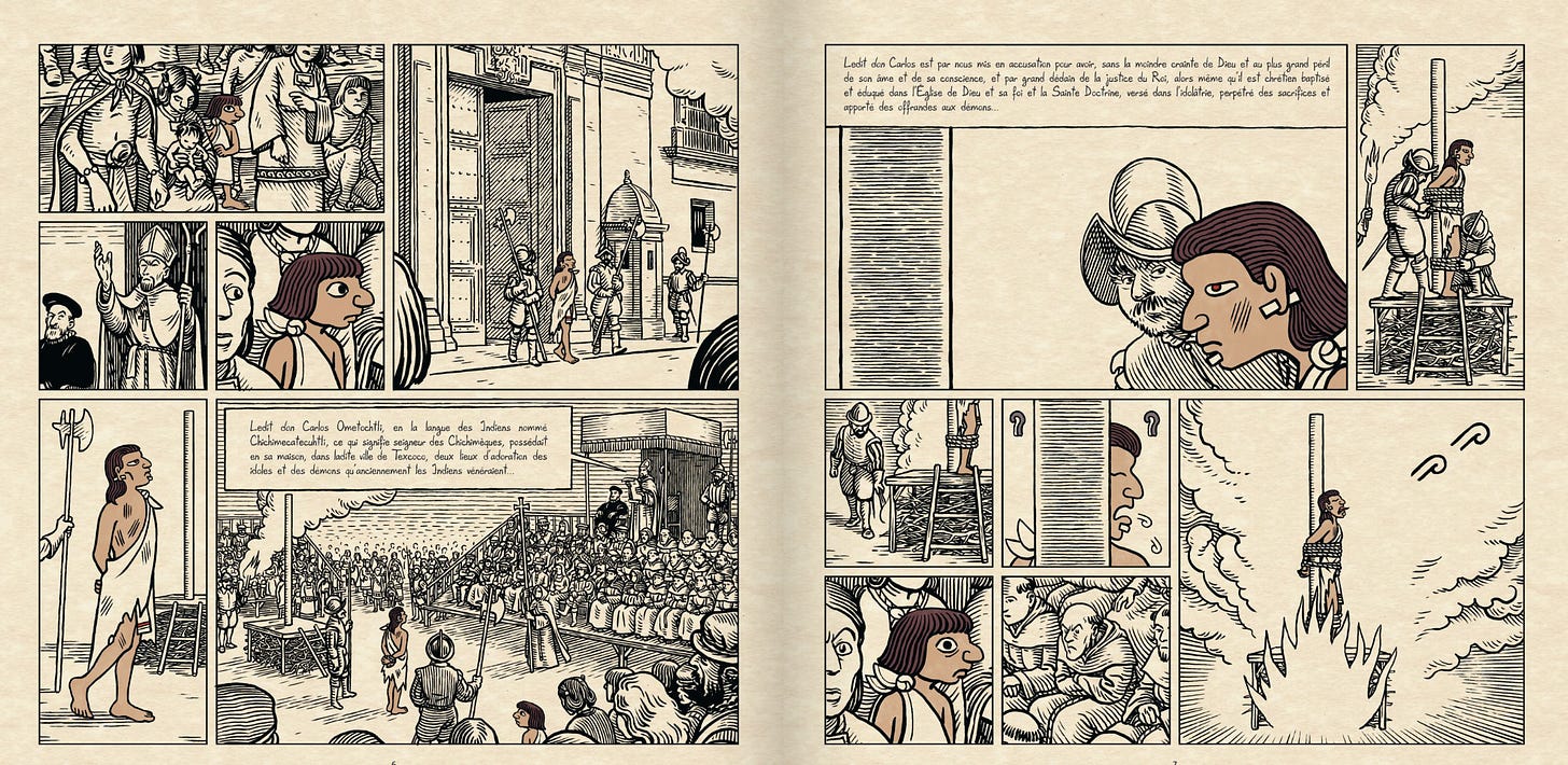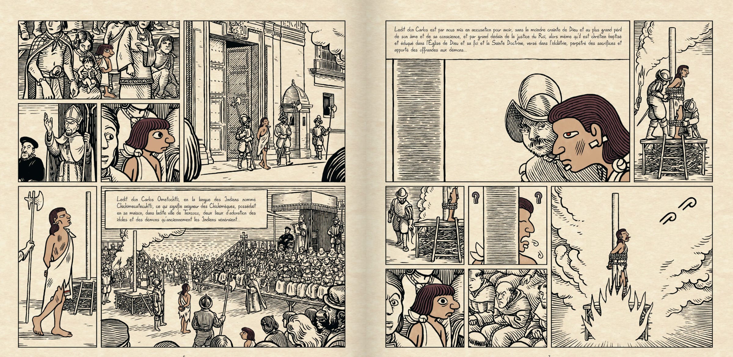 Mexique, 1539. Deux décennies après la conquête du pays, le franciscain Bernardino de Sahagún assiste impuissant à l’effacement de la culture aztèque. Il se lance alors dans un projet fou : compiler clandestinement les savoirs menacés d’oubli. Pour cette mission, il recrute Antonio Valeriano, un autochtone. Ce qui n’est au départ qu’un simple travail de scribe va devenir pour le jeune homme un voyage initiatique à la découverte de son propre héritage… L’auteur de BD Jean Dytar et l’historien Romain Bertrand signent ici une création unique. Inspirée du Codex de Florence, cette BD à la fois documentaire et romanesque mêle narration et érudition en évitant les pièges du manichéisme. Le dessin y oppose les gravures en N&B du monde des conquistadors aux pages colorées des codex mexicas, illustrant merveilleusement le tiraillement des personnages.